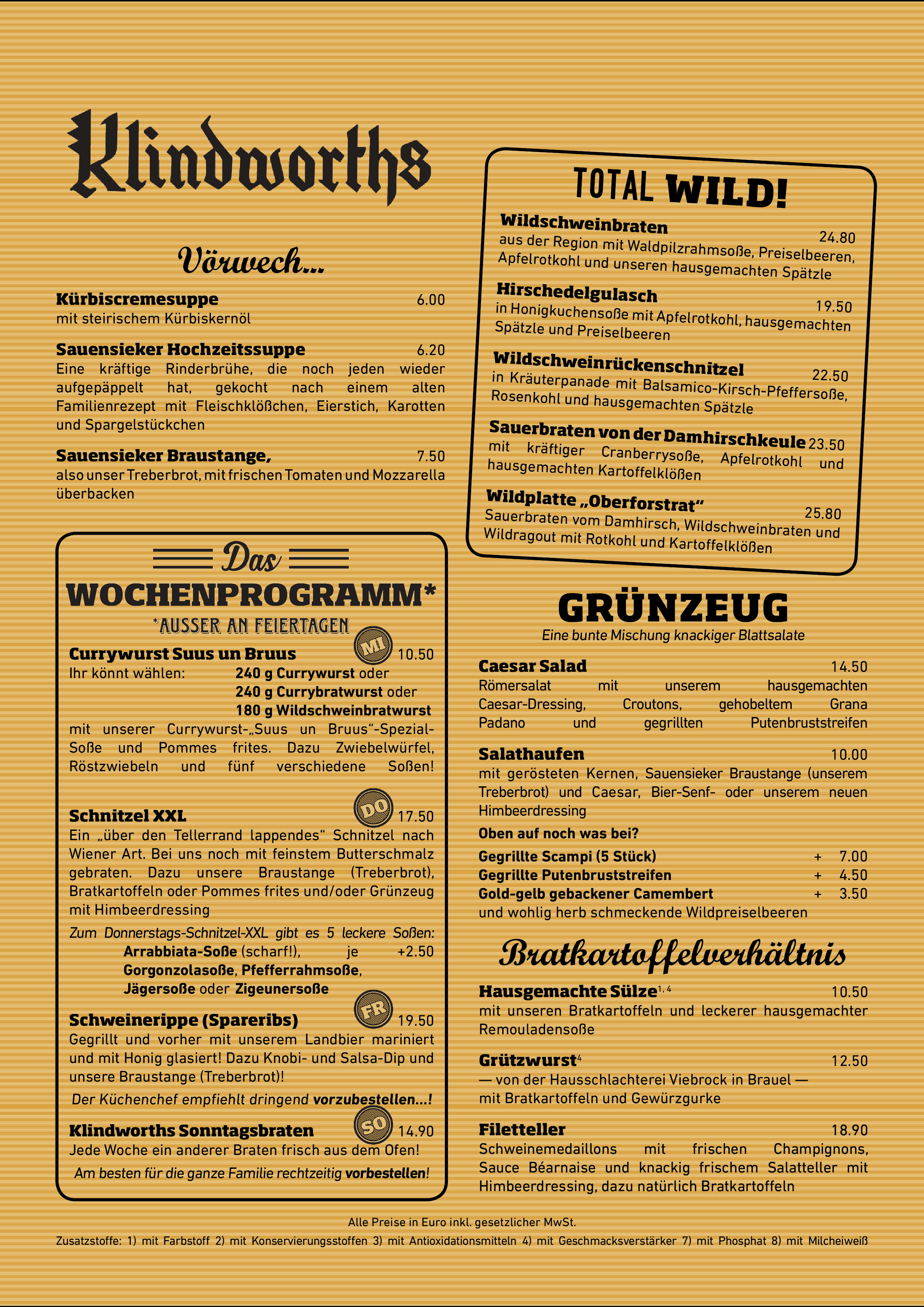 Mit Suppe und einer Vielzahl pikanter Vorspeisen, leckerem Salatbüfett, allerlei Fleischfreuden, Wild- und Fischgerichten, Vegetarischem und leckeren Desserts.